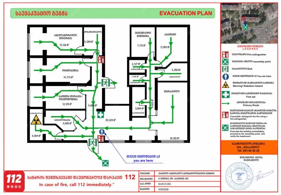 ევაკუაციის მარშრუტების, სახანძრო ინვენტარისა და გამოსასვლელების დატანას;