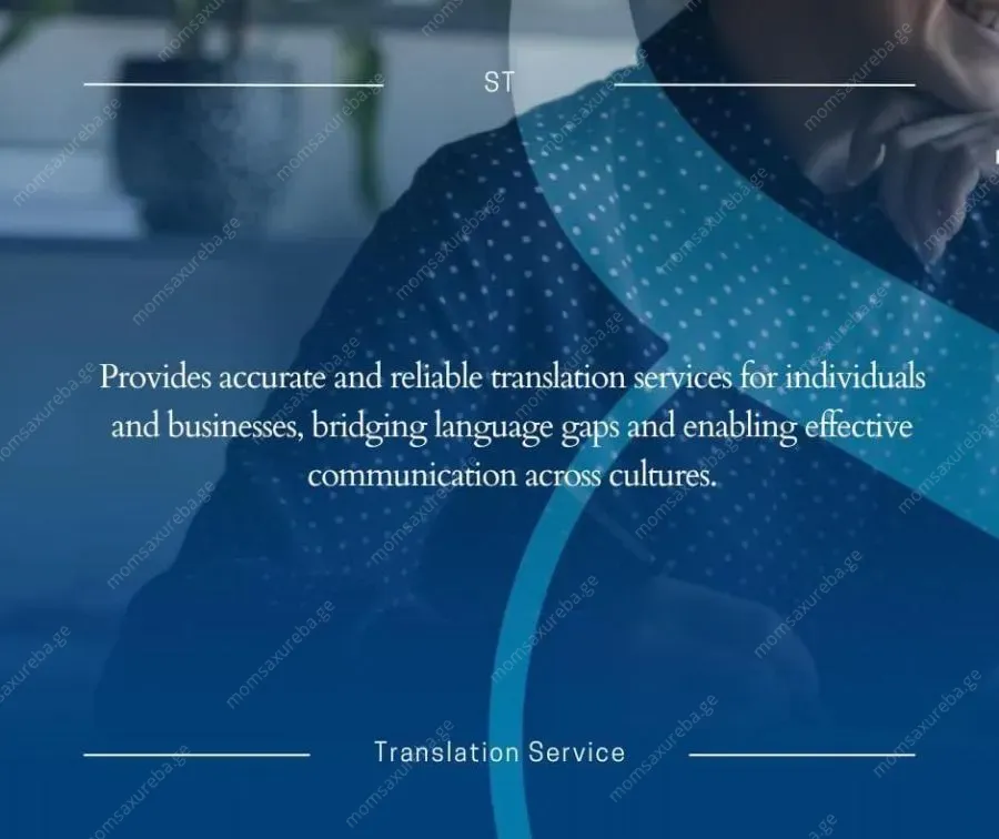 გაგიწევთ მთარგმნელობით მომსახურებას ისევე როგორც ტექნიკური, ასევე ყველა სხვა მიმართულებით. შეხვედრების, ტრენინგებისა და კონფერენციების თარგმნა მრავალწლიანი გამოცდილებით.