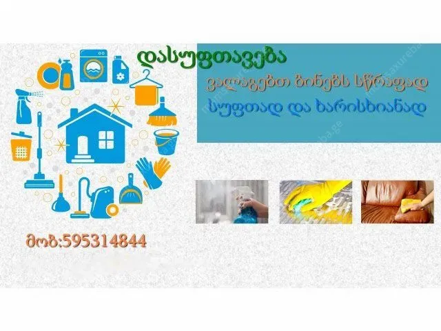 ვალაგებთ ბინებს სწრაფად და ხარისხიანად წლების გამოცდილებით გამოცდილებით სტანდარტული და გენერალური დალაგების ფასი განისაზღრება დალაგების კატეგორიის და სირთულის მიხედვით . მობ:595314844 მობ:579376108