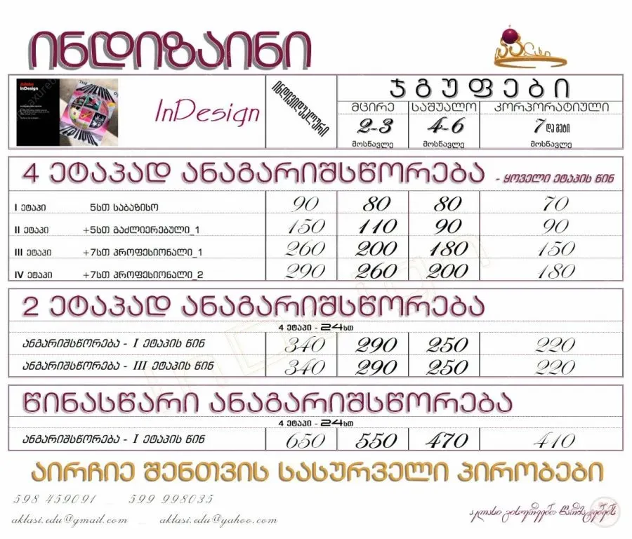 *გაძლერებული (5 სთ): ტექსტების და აბზაცების სტილების შექმნა (Character, Paragraph, Character Style, paragaph Style);ობიექტების შექმნა და მათი კორექტირება (Pathfinder, Align, Transform);განმარტებების(სქოლიო-footnot) ჩამატება;Master Page-ების დამატება;მარტივი ცხრილების შექმნა;მარტივი განახლებადი სარჩევის შექმნა;ბულკლეტების, ფლაერების, სერთიფიკატების, სავიზიტო ბარათების(და სხვა) შექმნა (პრაქტიკული სავარჯიშოები).