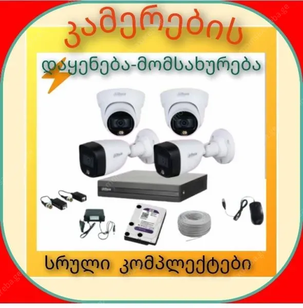 მოვემსახურები: როგორც კერძო პირს ასევე ორგანიზაციას. ვმუშაობ სირთულის და რაოდენობის მიხედვით. ტ: 571-008-369 : კომპლექტში შედის 1. 4 -არხიანი რესივერი დვრ. 2. 4 ც 2_მპ კამერა გარე და შიდა. 3. 80 მ კაბელი. 4ც 20 მეტრიანები. 4. 500 მყარი დისკი. 5. კამერების კვების ბლოკი. 6. 1ცალი მაუსი. 7. ტელ. დაპროგრამება და ჩართვა